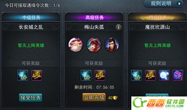 从具体操作上看,天涯追缉的玩法十分简单:通过功能入口进入天涯追缉的玩法界面后,诸位玩家可以根据英雄的实力,自由领取长安城之乱、梅山失孤、和魔扰坎源山等三个不同难度的追缉任务。
