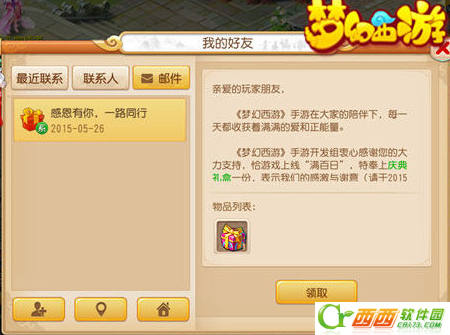 《梦幻西游》手游在大家的陪伴下,每一天都收获着满满的爱和正能量。《梦幻西游》手游开发组衷心感谢各位玩家朋友的大力支持,恰游戏上线“满百日”,特奉 上【庆典礼盒】一份,表示感激与谢意。达到30级的玩家朋友可以在2015年8月31日24:00前登陆游戏,通过感恩邮件领取庆典礼盒。