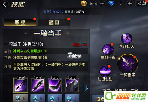 当距离敌人过远时,【一骑当千】一段攻击会变更为冲刺攻击,1技能点即可点出该效果,后续增加技能点可以增加冲刺的伤害,但是幅度比较低。该技能是作为攻击远方敌人的一个类似位移的手段,所以不建议玩家过多点该技能。