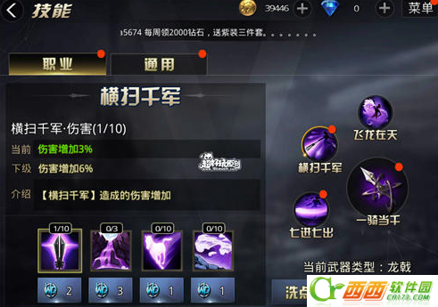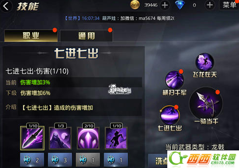 装备银枪/龙戟类武器时候,角色造成所有伤害增加。由于游龙可装备的主武器有银枪或者龙戟,所以玩家根据后期装备的那种装备来选择加哪个技能,但是必须满,所有伤害增加并非技能伤害的单体加成。