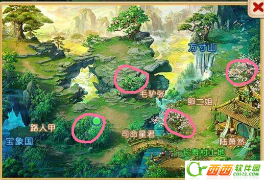 如图的4个粉色圈圈的位置就是此次4只凤凰仙子异兽的位置坐标,如果你还没有找到那么不妨在仔细观察一下,以下就是具体的凤凰仙子位置,大多数会被树木遮挡住,有些则与远古妖混在一起。