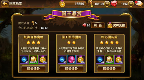 国王悬赏任务中,5星任务有很大概率可以得到150进阶石,还是非常划算的,玩家缺进阶石记得刷新出进阶石的悬赏任务。