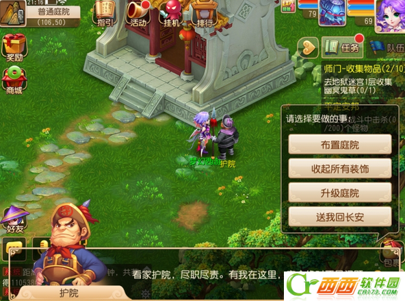 最初的庭院空空如也,玩家可以找庭院中的护院进入“布置庭院”模式,购买各种庭院装饰品。庭院装饰品种类包括:桌子、凳子、屏风、院墙、路砖、盆景以及其它杂物。庭院装饰品的摆放位置由玩家自己设计决定。