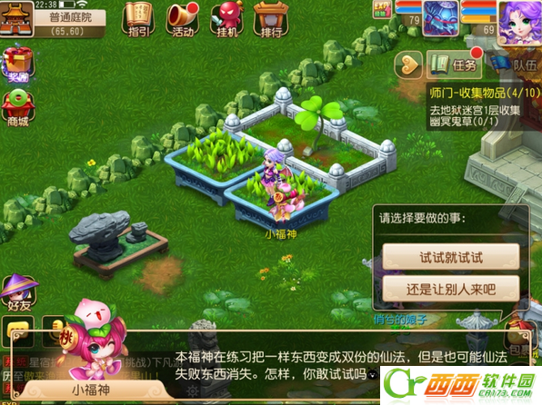 天降福神:玩家家中有可能迎来福神下凡。将某些东西(五宝、药品、烹饪、阵法书、宝石、魔兽要诀)给予小福神来施法,幸运的话东西将变为双份,不是那么幸运的话东西可就消失啦。一个小福神最多有十次施法机会,叫上朋友赌一下运气吧。