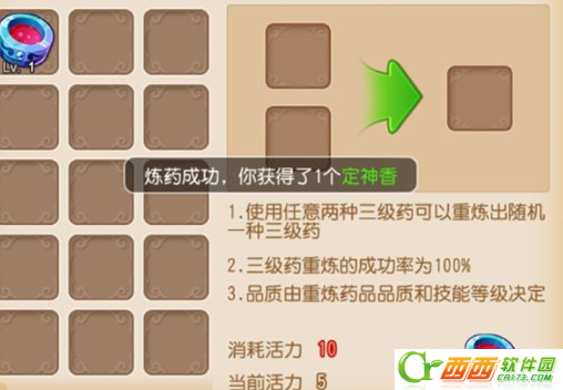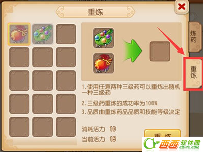 重炼说明:“花费10点活力将两个三级药重炼为一个三级药。重炼成功率100%,得到的三级药种类随机。