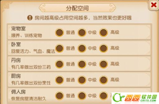 在游戏中民宅空间大小只有14点,空间很小,其中所有房间普通消耗2点,中级消耗6点,高级则是12点,所以如何分配空间选择宠物室、卧室、丹房、厨房和佣人房就显得很重要了。