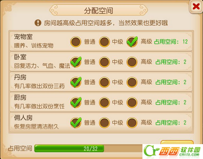 豪宅空间有32点,按照计算可搭配2个高级、1个中级1普通房间,这样就可以把豪宅分配空间最大化,不浪费时间。