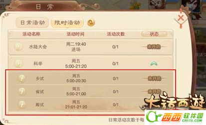 等级达到30级的玩家,在活动时间内通过活动面板的【限时活动】可以传送参与科举答题。