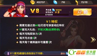 在V1用户的首充礼包中包含50个不知火舞碎片,可以解锁三星不知火舞。火舞拥有全屏秒杀的必杀技能,在游戏的前期属于高战斗力格斗家。