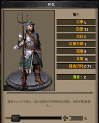 民兵攻击6、防御14、生命8、攻击距离1、速度8、负重10、粮食消耗0.21。