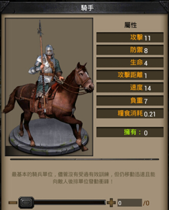 骑手攻击11、防御8、生命4、攻击距离1、速度14、负重7、粮食消耗0.21。