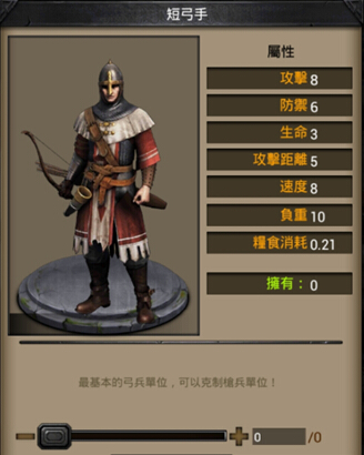 短弓兵攻击8、防御6、生命3、攻击距离5、速度8、负重10、粮食消耗0.21。