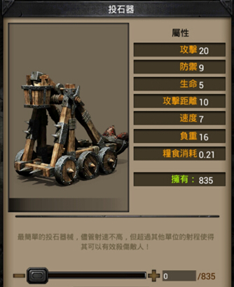 投石器攻击20、防御9、生命5、攻击距离10、速度7、负重16、粮食消耗0.21。