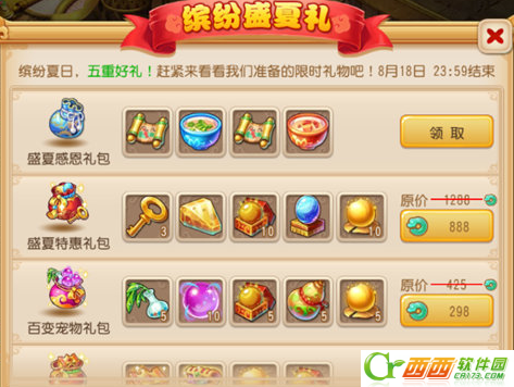 在8月18日晚上24:00点之前,所有40级及以上的少侠均可以免费领取一个盛夏感恩礼包。同时可以分别使用银币和仙玉购买其他超值折扣礼包。折扣礼包可以同时购买,但每个礼包限购一次,优惠多多,不容错过。
