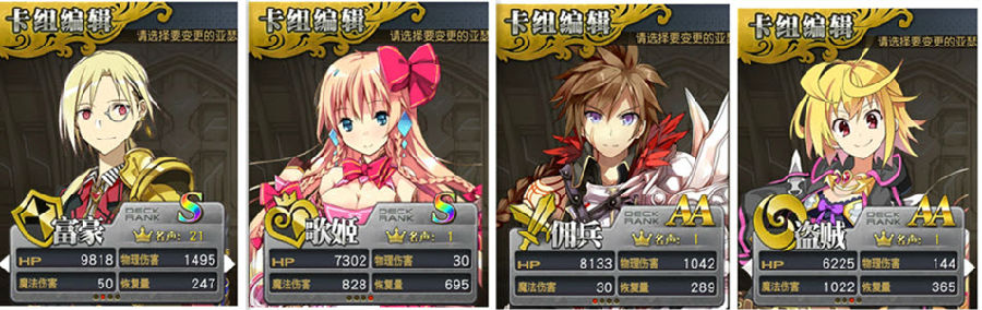 游戏共有4种职业,选择职业的意义在于,只有与主角相同职业的卡牌才可以发动觉醒技能。