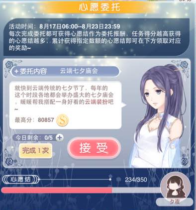 奇迹暖暖在七夕开启之际,为大家更新了一波全新的玩法,同时最新的七夕任务也上线了。这次的七夕任务可以说是有史以来奇迹暖暖最良心的一次玩法了,想要获得七夕套装,就要去接受委托,相信大多数的暖粉都接到的绫罗的云端的搭配任务,接到洁洁云任务的暖粉们请允悲,而这次的七夕任务也是得分越高就可以获得更多的心愿结。我们就一起来看一看云端任务下要怎么可以上到8W的高分吧。