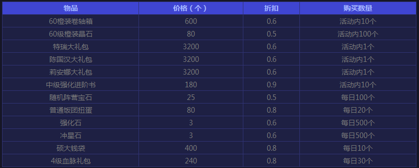 莉安娜大礼包,内含金币*30万,强化石*100,冲星石*100,莉安娜的信物*30,五级攻击血脉*2。