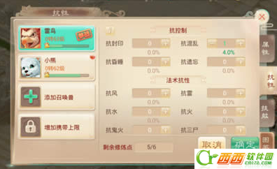 从图我们可以看到,加1点修炼点召唤兽的人法抗性增加4点,同样的是仙法等法术性抗性均是如此,也包括反震反震率。