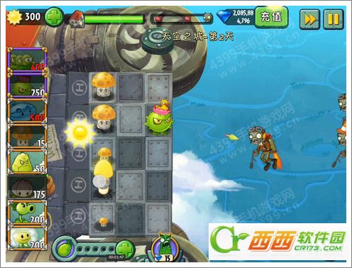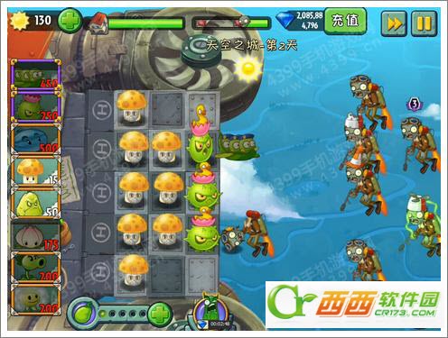 天空之城第2天怎么过?下面小编给大家带来植物大战僵尸2天空之城第2天图文攻略,一起跟随小编看看吧!植物大战僵尸2天空之城第二关由于还是没有空中能飞的植物,因此小编选择了一个植物能自动攻击多个僵尸的导向蓟作为突破。主要植物选择包括:阳光菇、窝瓜、豌豆小队、导向蓟、(其他随便拿,主要就是拿自动攻击的。)想要轻松过关的玩家们,赶紧来试试吧!