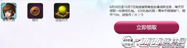 领取时间:9月29日至10月7日完成官网角色扮演活跃任务,每天可领取一份游戏礼包。