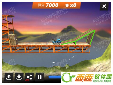 2.然后继续在地图右边第2处障碍这里,按之前的方法同样设置一个倾斜向上的斜坡,如下图。搭建好后点击屏幕左上角的汽车按钮开始闯关。