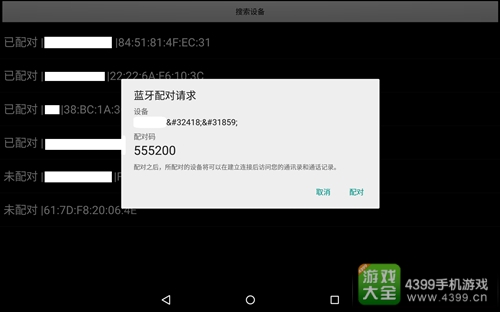 如图,就会显示出搜索结果,从结果中选择设备A点击进行配对,如果之前未配对的设备会弹出配对请求,核实设备名称后选择【配对】或【取消】
