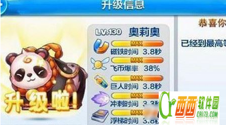 满级130级,磁铁时间3.8秒,飞币爆率38%,巨人时间3.8秒,冲刺时间3.3秒,浮梯时间3.8秒。金币+76%,表现+77%