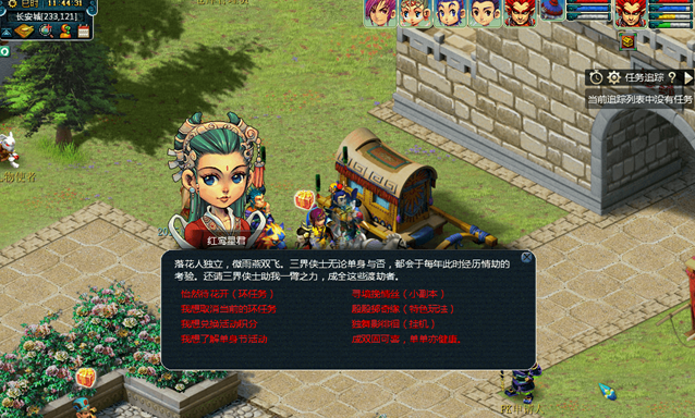 活动期间全天,≥30级的玩家可组队前往长安城(230,120)红鸾星君处领取“怡然待花开”任务,根据提示完成任务后,可获得金钱、物品及积分奖励。