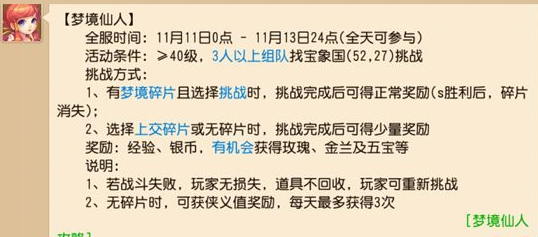 先看看精灵对于梦境仙人的介绍:需要玩家>40级组成至少3人的队伍,且队友都需要有“梦境碎片”。成功挑战可以获得五宝和玫瑰花和金兰花等等随机奖励!