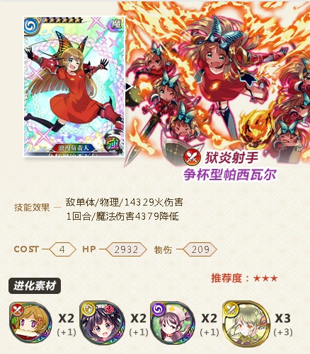 火香菜可以被看成一个物理版稳定性更高的R姐,4379妨害量基本可以在团队自身拥有防御BUFF的前提下将BOSS魔法伤害降至挠痒。风属性副本带上勉强是个不错的选择,但其他环境下也只能是把她当做功能性卡牌来使用,有着一定的局限性。