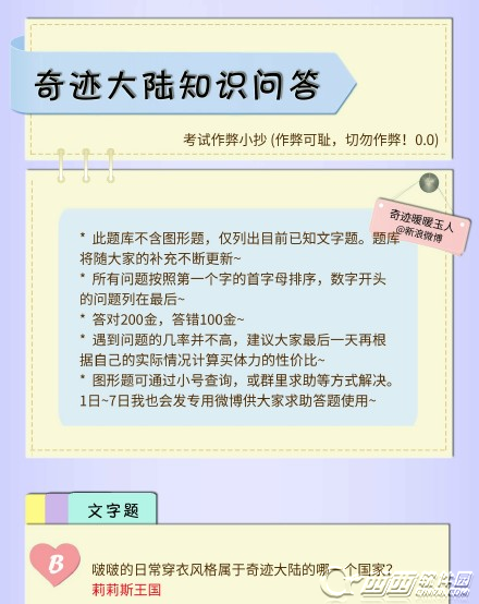 奇迹暖暖中刚刚出了奇迹大陆知识问答的活动,答对的问题越多奖励也就越丰厚,可以获得钻石金币等等的奖励,下面小编就来给大家介绍一下奇迹暖暖奇迹大陆知识问答活动全部问题答案一览,各位玩家可以来参考!