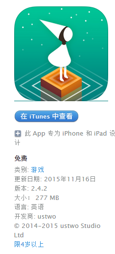 纪念碑谷这款ios上的经典游戏在2014年刚推出时就大受好评,而且获得了2014年度苹果设计奖。这款游戏的每一个画面基本都可以作为一个壁纸,游戏本身也是非常有趣,最近这款游戏在中国区app store终于开启限免了,这也是纪念碑谷首次限免,现在我们再也不用支付25元来购买这款游戏了,趁着限免赶紧下载吧!