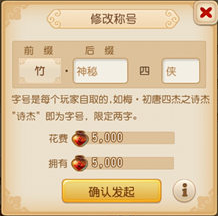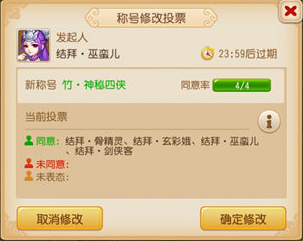 修改称号界面修改称号:任一结拜成员都可以发起修改称号请求,每次修改称号将花费5000点结义值,请求后需要新的称号得到80%结拜成员同意方能成功。