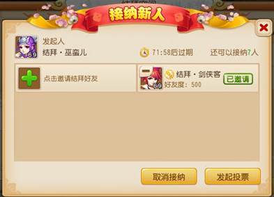 接纳新人:任一结拜成员都可以发起接纳新人请求,邀请完欲接纳的新人后,需要发起接纳新人投票,待有新人被全员投票通过之后,才能发起接纳新人仪式,完成仪式之后新人便正式加入结拜组。