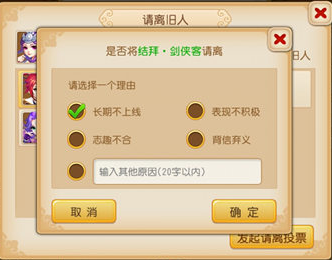 请离旧人:在结拜组成员数量≥3人时任意结拜组成员都可以发起请离旧人申请,每次只能请离一人,待选择完请离理由后,需要获得结拜组成员60%同意之后,才能正式发动请离。