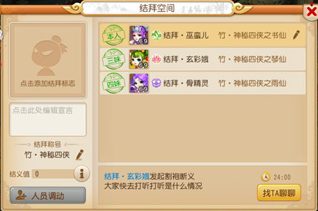 而基于空间还会有一系列的结拜功能,其中包括修改字号、称号,接纳新人、请离旧人、割袍断义。