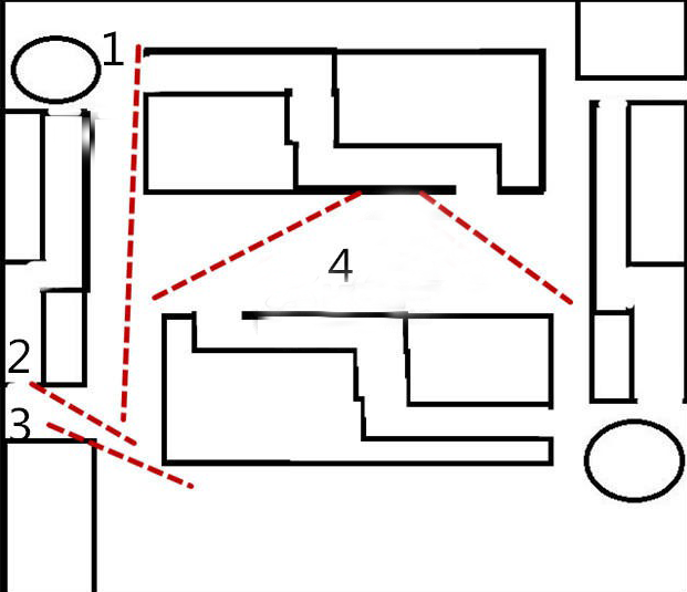 在上图中,红色虚线代可狙击位置,这些位置显著特点就在于多处于拐角处和隐蔽位置,这也给我们带来一个启示就是在这幅地图里面两边路径将会是最为激烈的交战点。那就要告诉我们在战斗时注意在哪些地方避开。