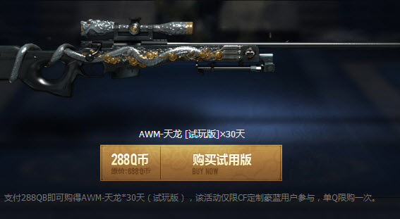 支付288QB即可购得AWM-天龙*30天(试玩版),该活动仅限CF定制豪蓝用户参与,单Q限购一次。