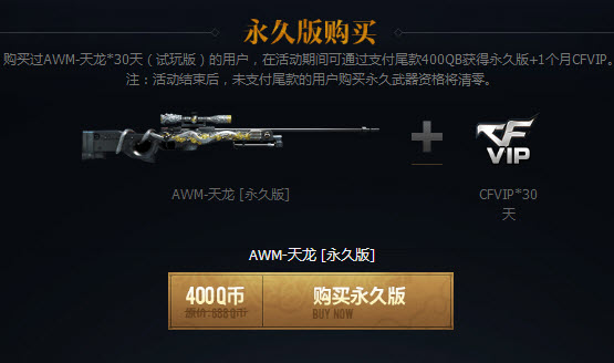 购买过AWM-天龙*30天(试玩版)的用户,在活动期间可通过支付尾款400QB获得永久版+1个月CFVIP。