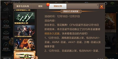 1、12月18日,满精通圣诞武器上架,包含M4A1-圣诞、AWM-圣诞、AK47-圣诞、沙鹰-圣诞以及糖果手雷。