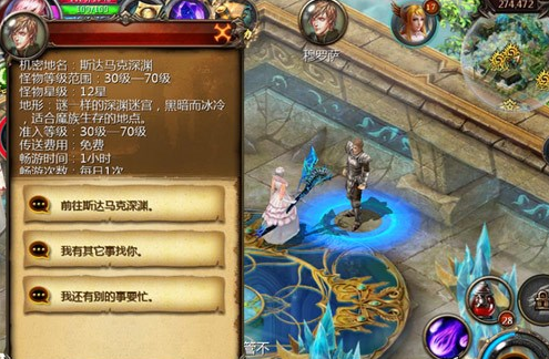 首先我们要找到去往深渊的NPC:驱魔远征军•穆罗萨(卡萨诺城 273.473),就在领双处右边,可以先去领个双倍再去深渊。更让人惊喜的是,去往深渊对于新人来说也特别友好,与火山、迷宫不同,斯达马克深渊是完全免费(每日1次,每次1小时)。