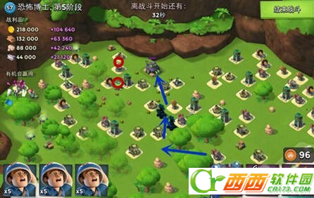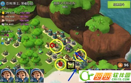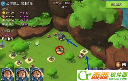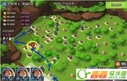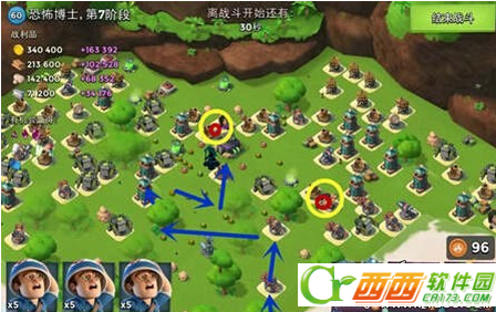 使用导弹炸掉大加农炮和菊花器,然后医坦上去拆防御建筑,走中间这条线路,拆掉狙击塔和小加农炮后,医坦顶住火箭的伤害拆掉基地。