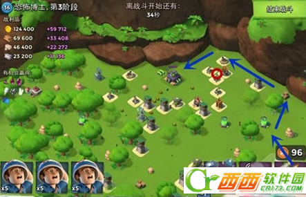炸掉红色位置的大加农炮和狙击塔,然后胖妹过去拆剩下的三个防御建筑,这边可以使用震爆弹,最后轻松拿下基地。