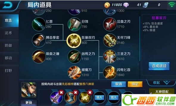 1前期首先带一把铁剑出门,然后出匕首,为出破灭君主做准备,出完破灭君主,开始准备出狂暴双刃,最后是出一件急速战靴,让狄仁杰可以更好的边跑边打。