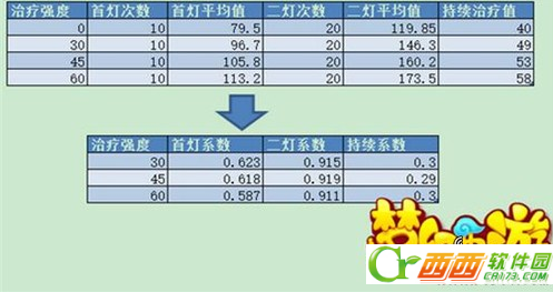从以上数据可以看出,在修炼等级为0,治疗强度也为0时,首灯治疗值约为技能等级4倍,二灯治疗值约为技能等级6倍,持续治疗值(这里没有“约“)等于技能等级2倍。验证了假设1-3中的技能等级对治疗量的影响系数。