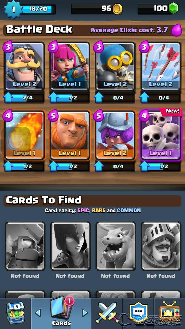 很多以coc为原型创作的,玩起来并不陌生,实力都比较平均,也多了好多新角色。比如哥布林分好几种,我暂时只有普通哥布林和spear哥布林(丢矛的),还有的卡能一口气召唤10只骷髅╭(°A°`)╮等等。值得一提的是,炸弹人无限扔炸弹好给力,还可以一下炸死一片骷髅,我以为冲过去自爆呢 ╯﹏╰