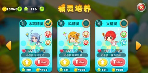 从本质上来说,消除是一种讲求即时性微操的玩法,而RPG则在于等级、装备及各种周边的逐渐升级养成,这两者天然难于融为一体,但《口袋甜心》却做到了。这种做法可以认为是“讨巧”,RPG元素撇除了与游戏主角的关系,而是围绕游戏设置的精灵系统来完成。精灵系统作为主角消除糖果与击败BOSS的中间执行者,精灵是直接面对怪物BOSS的,而游戏主角只能通过消除来为精灵增加能量,这样玩家(游戏主角)就可以专注提高消除技能,而精灵则专注RPG式养成获得各属性的成长。