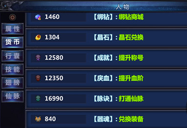 除此以外,还有一些其他货币:晶石、成就、戾血、脉诀、器魂