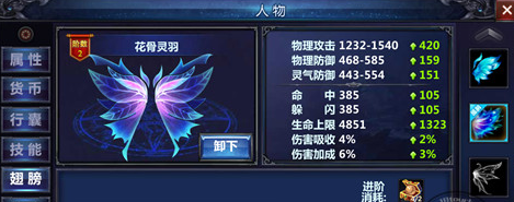 翅膀进阶:翅膀要消耗各种仙丹进行进阶,翅膀进阶后不光外形更加华丽,属性也会获得全面提升!
