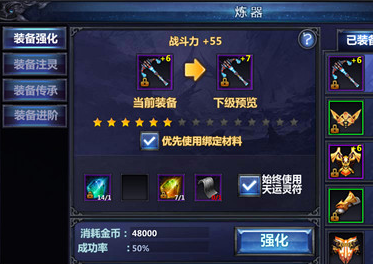 装备强化:装备强化能够提升装备的星级,需要消耗各种级别的晶火,但是装备强化到高等级时成功率会降低,一定要注意使用天运灵符来确保强化失败也不会下降到1级;